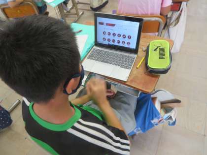 一人ひとりのタブレット端末を使ってルールや魅力を調べています。