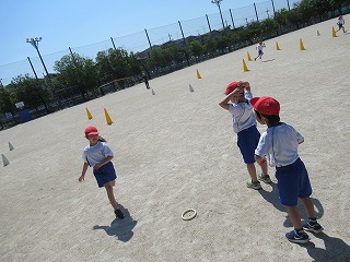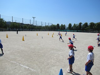 今日は1年生のときにも経験したコーンの間を走る折り返しリレーを行いました。