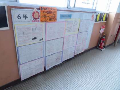 6年生の廊下には,自主勉強のコピーが掲示されています。