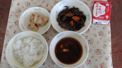 今日の献立は,ごはん・牛乳・牛肉とひじきのいため煮・たけのこのおかか煮・赤だしです。