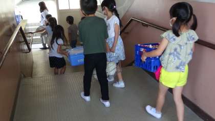 給食が終わると自分たちで食器を片付け,当番は担当の食器具を運びます。