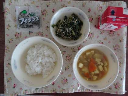今日の献立は,ごはん・牛乳・和風カレーどうふ・ほうれん草ともやしのごま煮・じゃこです。