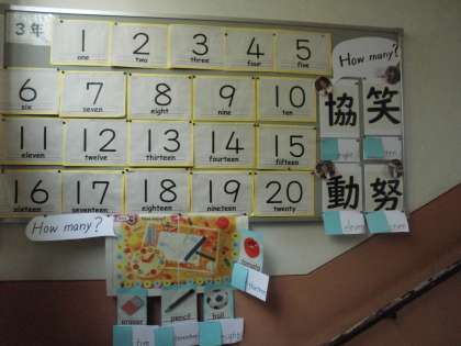 3年生の外国語活動では,英語でものの数を聞いたり,答えたりする活動をしています。もうすぐ「この漢字(笑)が好きです。」と好きな漢字を紹介して,その画数を英語で聞いたり,答えたりする活動になります。