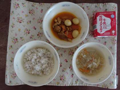 今日の献立は,麦ごはん・牛乳・鶏肉とうずら卵のスパイシーいため・スープです。