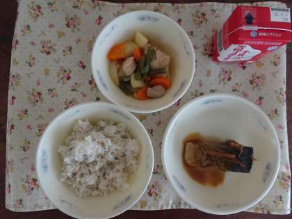 今日の献立は,麦ごはん・牛乳・さばのかわり煮・鶏肉と野菜の煮つけです。