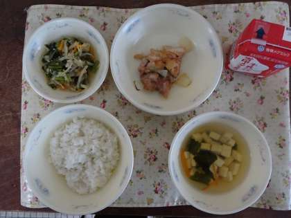 今日の献立は,胚芽米ごはん・牛乳・鶏肉のてりやき・小松菜と切干大根の煮びたし・すまし汁です。