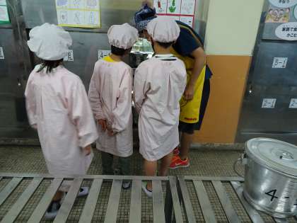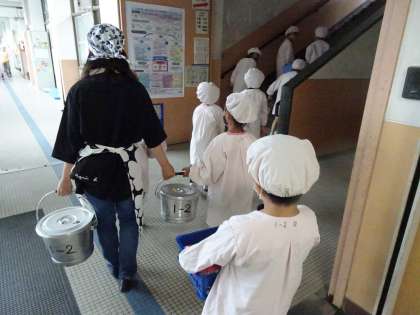 4時間目の終わりのチャイムが鳴ると,身だしなみを整えて,給食当番さんが給食を取りにサービスホール来ます。みんなで力を合わせて,クラスの分の給食を一生懸命運んでくれています。