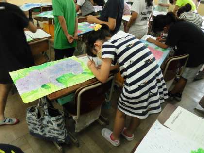 今日はみんなで鑑賞しました。まず,自分のがんばったところを書きます。それから友だちの絵を見て,すてきなところを見つけて書いていきます。