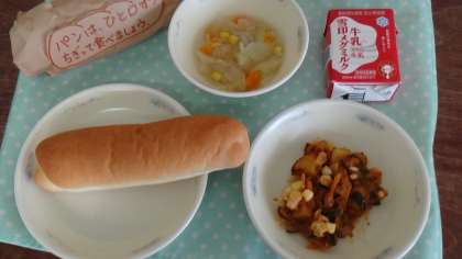 今日の献立は,コッペパン(国産小麦100%)・牛乳・