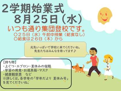 25日から2学期がスタートします。元気に学校に来てくださいね。