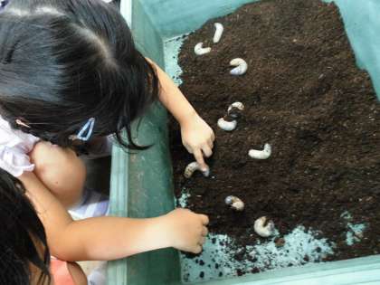 生活「いきものとなかよし」でどんな生き物を見つけたことがあるかな。どんな生き物を育てたことがあるかなと話をしました。1年生で育てていたカブトムシが卵をうみ,夏休み中に幼虫にまで育っていたのでそのカブトムシの幼虫をみんなで見ながら子どもたちは「初めて幼虫さわった。」と盛り上がっていました。生き物を飼うのはなかなか大変だけれど命の大切さやどうやったら大切な命を育てていけるかななど生き物を通して命の大切さに触れていきたいです。