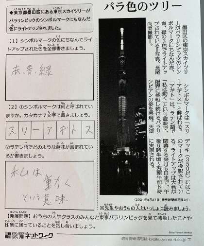 東京都墨田区にある東京スカイツリーがパラリンピックのシンボルマークにちなんだ色にライトアップされた記事から