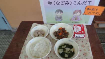 お月見献立です。今年のお月見は9月21日ですが,給食では少し早く登場します。この日の月は「中秋の名月」といわれ,一年で最も美しいと言われています。月見には,秋の収穫に感謝したり,来年の豊作を祈ったりして,この時期にたくさんとれる里いもを供える習慣があります。