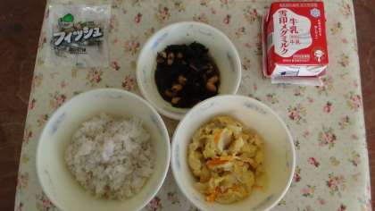 今日の献立は,麦ごはん・牛乳・あげたま煮・ひじき豆・じゃこ です。