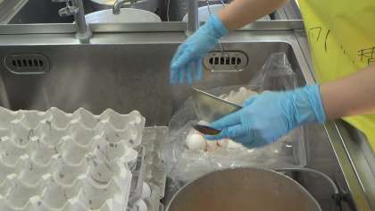 ひたすら卵を割る様子をビデオで撮り,なかなか見れない給食室の様子