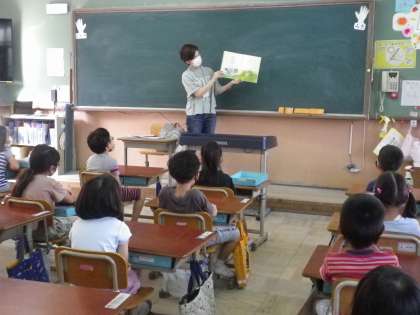 今日は,よみきかせサークル・モモタロウの方々が教室に来て