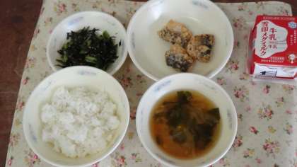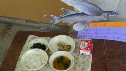 今日の献立は,ごはん・牛乳・とびうおのこはくあげ・