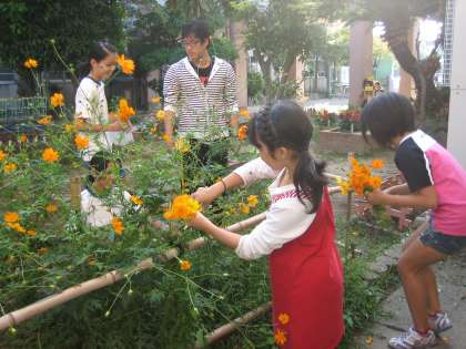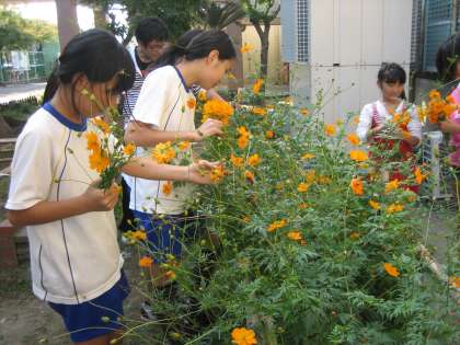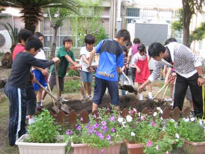 『栽培委員会』では,花壇の土を耕したり,自分たちが育てた草花を