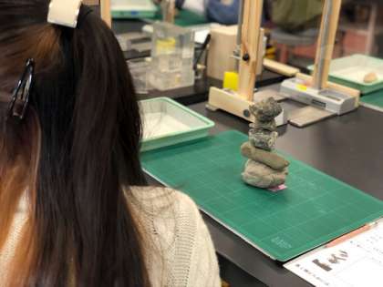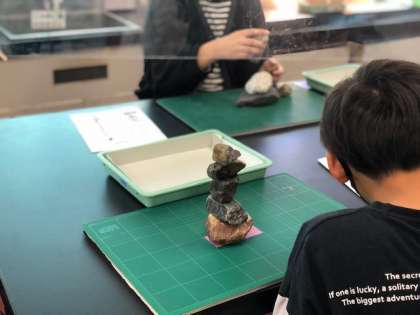 物理コース「バランスの科学」では、石をバランス良く高く積むことから学習がスタートしました。