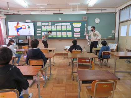 英語の読み聞かせを聞いたり,体を動かしたりと