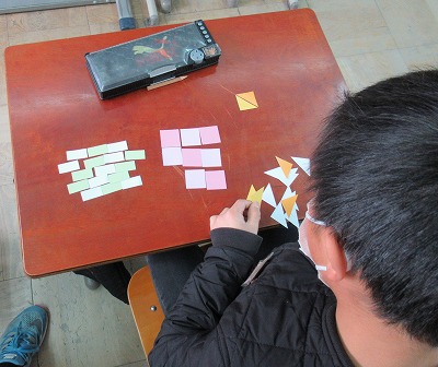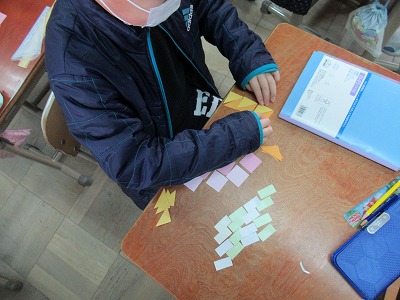 模様づくりの作業を通して,形を組み合わせると別の形ができたり,形の特徴を生かして色々な模様をつくることができたりすることを体感しました。
