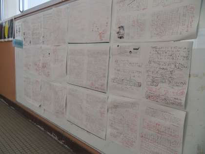 廊下の掲示板には考えの足跡が残っているノートが貼られています。
