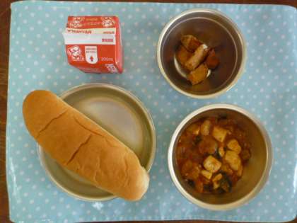 ◆ミルクコッペパン ◆牛乳 ◆えびととうふのケチャップ煮 ◆大学いも