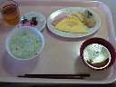 今日の献立は,ご飯,オムレツ,ハム,スパゲティサラダ,さわらの西京焼き,味噌汁,です。