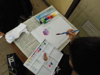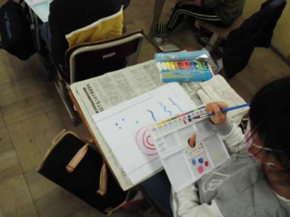 絵の具を使っていろいろな色の線や点などを描きました。世界に一つだけのTシャツの完成です。