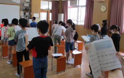 初回は美しい声の出し方や姿勢を学び,校歌やBelieveを歌いました。