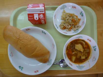 ◆黒糖コッペパン ◆牛乳 ◆ボルシチ ◆れんこんのソティ です。