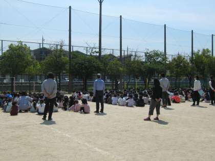 地震が起こって,家庭科室から火災が発生し,子どもたちは運動場に避難するという訓練でした。