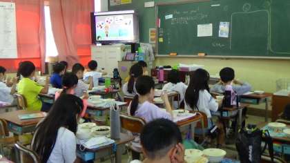 教室では,和献立のキャラクターの,なごみちゃん,かずくん,みやこおばあちゃんが案内する動画を見ています。