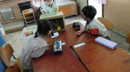 ボックスの中に手を入れ,なかみを見ずにお題の形がどの積み木か,当てるゲームをしました!