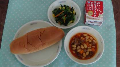 今日の献立は,味つけコッペパン・牛乳・大豆と牛肉のトマト煮