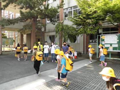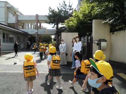 PTAのみなさま,児童会の子どもたち,そして教職員が正門に立ち,