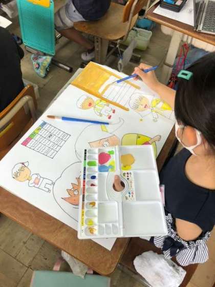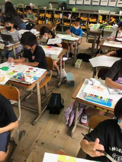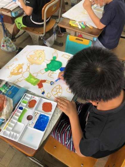 下書きが終わった後は、絵の具で色を塗っています。丁寧に、丁寧に、集中して塗っています。とてもよく頑張っています。