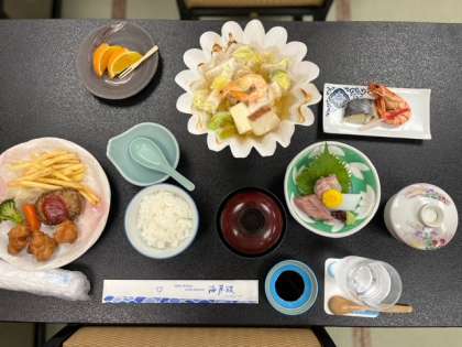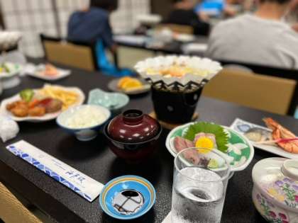 待ちに待った夕食です。お刺身や焼き魚など海の幸をたくさんいただきました。子どもたちは大満足の様子でした。