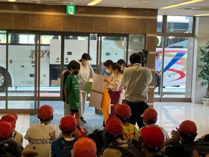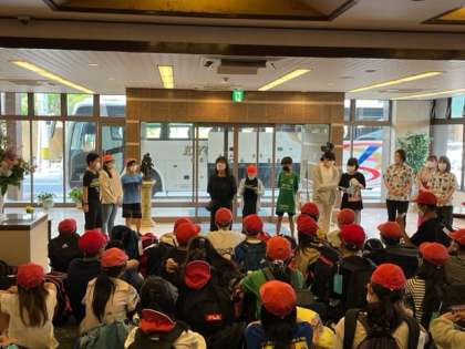 退館式を行いました。二日間お世話になった海月館スタッフのみなさんに感謝の気持ちを込めたお手紙を渡しました。今から姫路セントラルパークに向けて出発です。