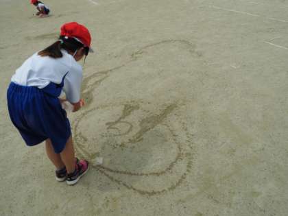 空き容器を水鉄砲に見立てて,的をねらったり,運動場に絵をかいたり…