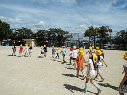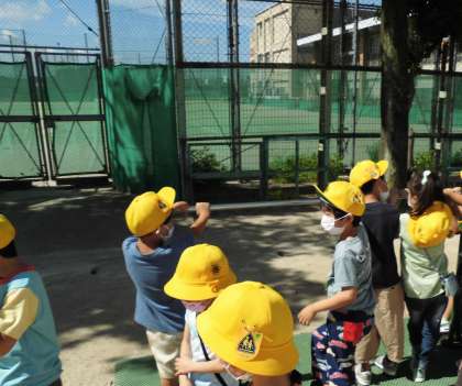 教室で春の様子を思い出してから探検に行くと,「葉っぱが緑になってる!」「雲がとってももくもくしてる!」「鉄棒は触るとあたたかい!」と夏の特徴に気づくことができました!