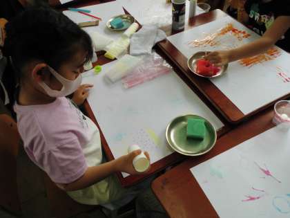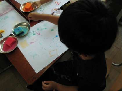 いろいろな形を絵具を付けてスタンプのようにぺったんぺったんしました。