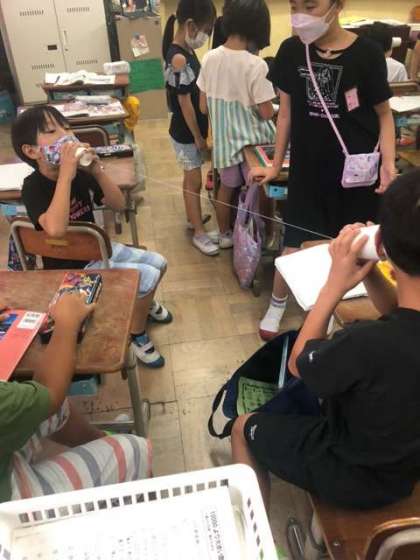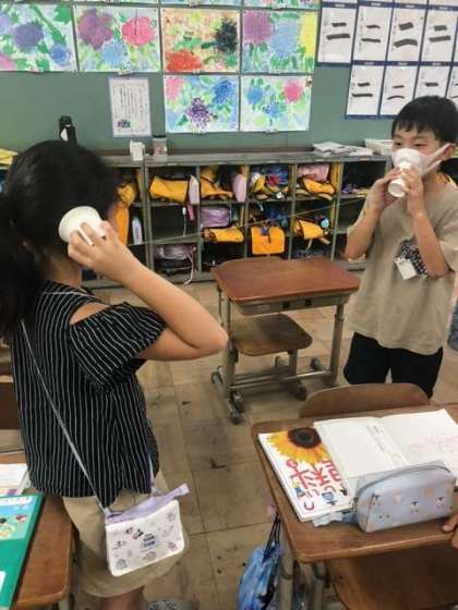 糸電話を使って音のふしぎを調べました。すると、「糸がふるえているかも。」と気づいている子ども達もいました。その後、音の伝わり方を実験し、声を出すと糸の真ん中にあるスパンコールが揺れていることが分かりました。