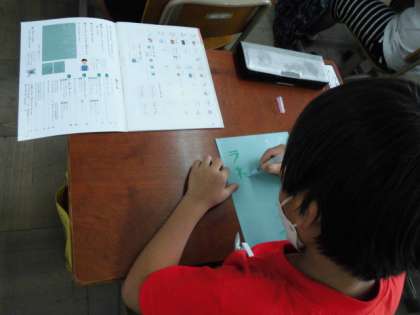 だんだん慣れてきたのか、「『すうっ(はらい)』の字、ほかにもないかな?」という問いに「『あ』もある!」と自ら見つけて書こうとする姿がありました。