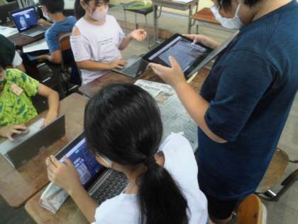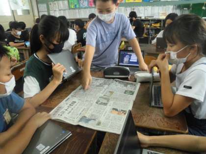 新聞の工夫や特徴についてタブレットを使ってまとめていました。読者が読みやすいように文字の大きさを変えたり,内容を短くしたりと新聞の工夫を多く見つけていました。