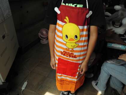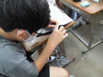 家庭科の学習で裁縫セットを使って、エプロン作りをしています。