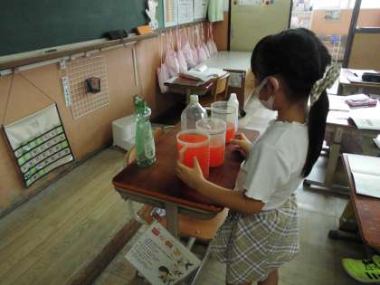 どの入れ物に水が一番多く入っているか調べるには,「同じ入れ物に移し替えてどっちが高いか見るとわかるよ!」と,実際にやってみて,よくわかったようでした!