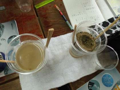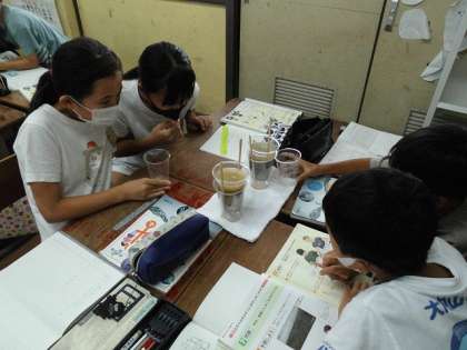 土の石の粒の大きさを観察して,運動場と砂場の土について予想し,実験しました。