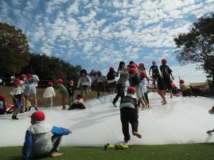 長い滑り台やトランポリン、大きいアスレチックなど、