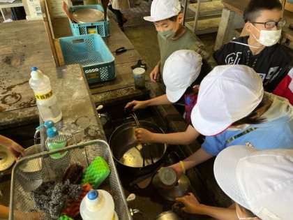 最後の後片付けです。鍋をピカピカになるまで磨いています。